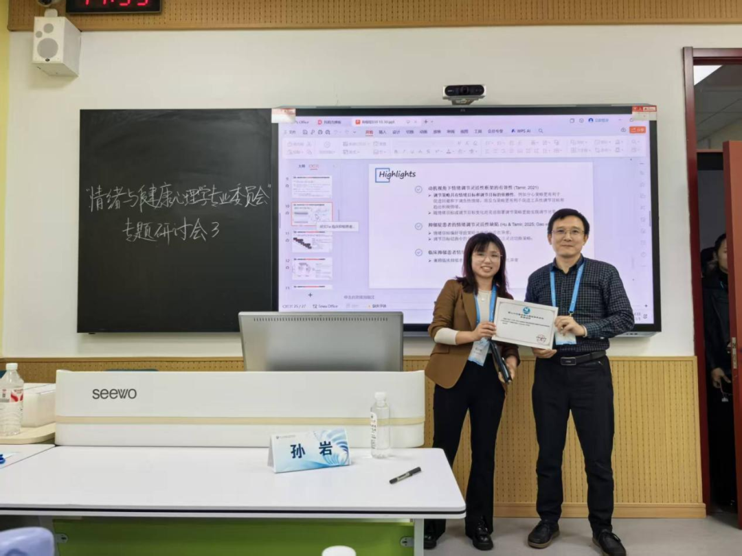 会上,我院教师在大会分组报告中纷纷发言。汪俊教授主持“普通心理与实验心理专业委员会”口头报告分场3,并作《人际接近-回避动作对联合Flanker效应的调节作用》的口头报告;谢瑞波教授主持“‘发展心理专业委员会’专题研讨会 7——家庭教养与亲子关系的发展特征及其对子女适应的影响”主题会议;詹沛达副教授作《基于心理测量建模与深度学习的视觉计算模型在认知策略识别中的应用研究》的专题报告;王小琴副教授作《动机视角下临床抑郁患者缺乏情绪调节灵活性的表现机制》的专题报告;李城林博士作《重构面孔直觉:心理轮廓与知觉轮廓如何共同影响胖脸错觉》的专题报告;滕静博士作《视觉艺术教育、表象加工与创造力的关系研究:基于正则化结构方程模型的路径分析》的口头报告;高叶淼博士作《亲子冲突、青少年非**性自伤和外化问题的发展级联关系》的专题报告。