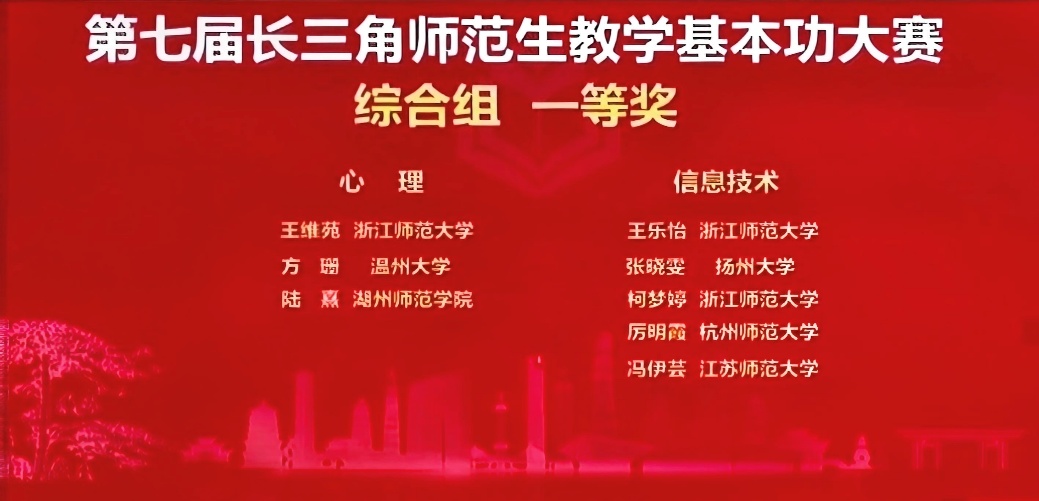11月14—16日,第七届长三角师范生教学基本功大赛在安徽师范大学举行,我院学子王维苑凭借出色的教学素养和扎实的专业功底,排名综合组-心理的第一名,荣获一等奖的好成绩。此次王维苑同学的获奖,是继2023年陆昱冰、2024年樊文悦之后,我院学子连续第三年在该项赛事斩获一等奖的佳绩,充分展现了我院师范生培养的学科优势与深厚底蕴。
