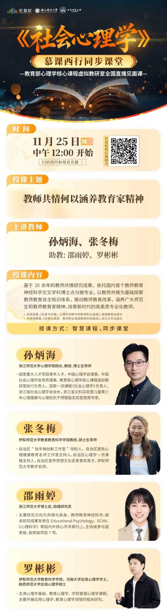 浙师-伊师同步课堂|孙炳海等主讲“教师共情何以涵养教育家精神”:教育部虚拟教研室《社会心理学》全国直播见面课